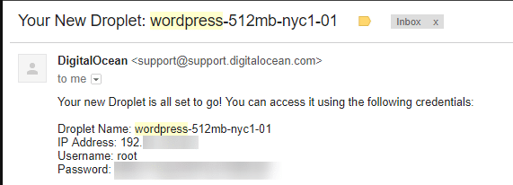 An email is sent after the creation of the droplet containing public IP to the Droplet, username and password. The username is set as ‘root’ and a default password is a randomly generated one.