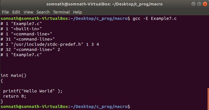 In Example7.c we have got a string “Hello World” using STRINGIZING macro.