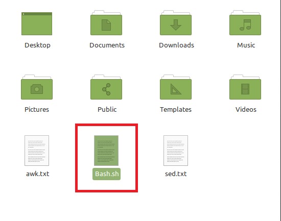 First, create an empty document in the home directory of Linux Mint 20 and give it any name you prefer, followed by the .sh extension. For our scenario, we have named the document ‘Bash.sh,’ as shown in the image below:
