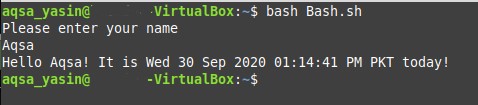 Execute the same bash script again. This time, after entering your name, the terminal will also show you the current date and time while addressing you with your name, as shown in the following image: