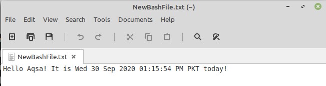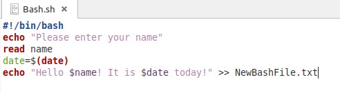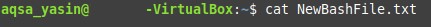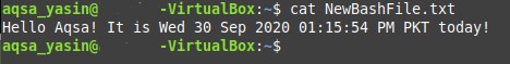 At times, you may not want the output of a bash script to be displayed in the terminal; or rather, you may want the output to be saved in another file. To do this, you will have to modify the bash script yet again. This time, you only have to add the ‘>>’ symbol, followed by the file name where the output is supposed to be stored, after the ‘echo’ command that was initially used to display the output on the terminal. The ‘echo’ command, followed by the ‘>>’ symbol and the file name, is used to store the output of the bash script to the file instead of displaying it in the terminal. In our case, we have named the output file ‘NewBashFile.txt,’ as you can verify in the image shown below: