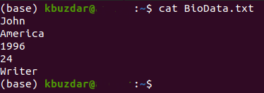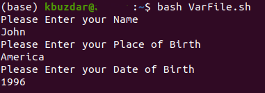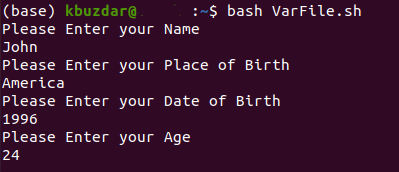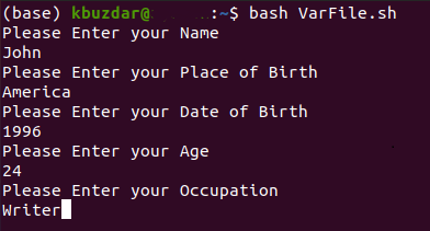For demonstrating the method of writing a variable to a file, we would like to show you the scenario in which the terminal asks the user about his Biodata such as name, age, date of birth, etc. and stores each of these entities in a separate variable. All of these variables are then written on a text file. For doing this, you will have to proceed as follows: