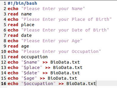 After doing this, type the code or script shown in the image below in your newly created Bash file. This script is asking the user about his details one by one. It takes the name, place of birth, date of birth, age, and occupation of the user as an input. The echo command in this script is used to display messages on the terminal whereas the read command is used to store the input provided by the user in the respective variables. Once the user has provided all the inputs, this script stores the values of all these variables to a text file named BioData.txt. When the echo command followed by a variable is used with “>>” symbol followed by a file name, then it aims to store the value of that variable in the specified file. So, basically what we are trying to do is to save all the values that were provided by the user in a single text file by writing their respective variables to that file. Also, we have enclosed the variables in double quotes so that they are treated exactly as variables. When a variable is written within single quotes, then it is treated as a string. Moreover, whenever you want to access the value of a variable, you must type the “$” sign before it, otherwise, you will not be able to access its value.