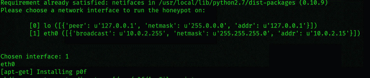 Dionaea will configure itself, and it will ask you to select the network interface you want the honeypot to listen on after the dependencies and applications are downloaded.